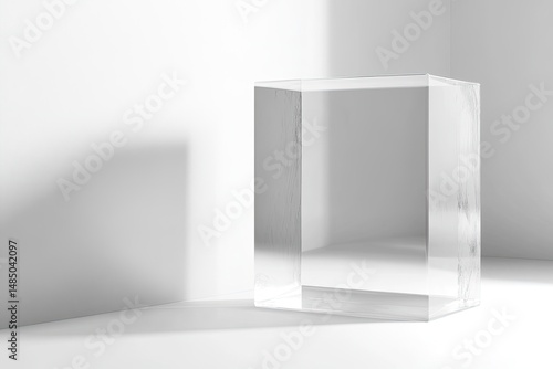 Empty, clear acrylic cube on white background