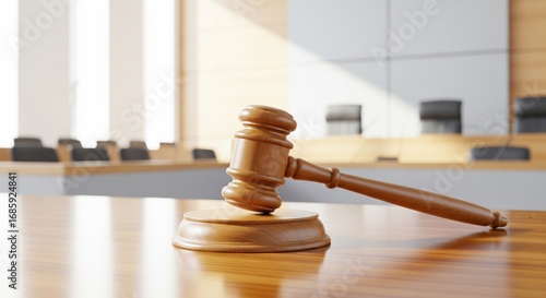 Empty courtroom with gavel on wooden desk in sunlit setting