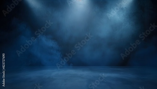 empty dark blue abstract cement wall and studio room with smoke float up the interior texture for display products wall background