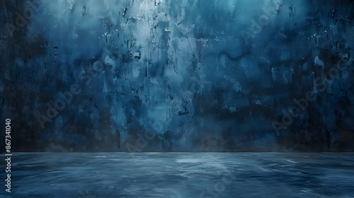 Empty Dark Blue Studio Background and Grey Floor Concrete perspective with blue soft light well editing Floor Display product and text present on Wall Room Empty free space Black Cement Backdrop photo