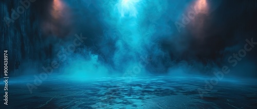 Empty dark room with concrete floor and neon light in the middle, industrial background