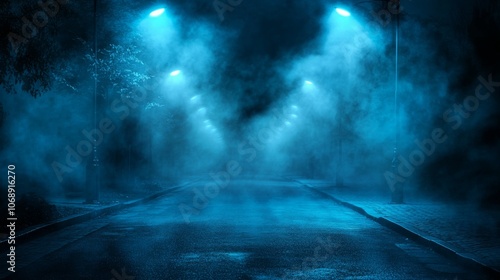 Empty dark street with spotlights and blue tones, studio-like texture with floating smoke; an isolated night view. -