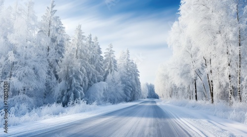 Empty frozen road through idyllic snowy forest in winter.