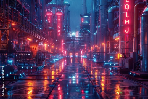 Empty futuristic factory, robotic assembly lines, high-tech machinery, neon lighting, cyberpunk aesthetic. Generative AI