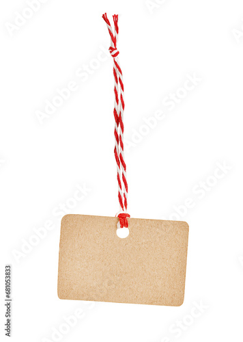 empty gift tag made of brown craft paper with red striped twine. isolated on a white background
