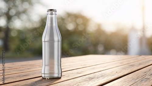 Empty glass bottle on wooden table with soft bokeh background, sunlight creating a natural ambiance