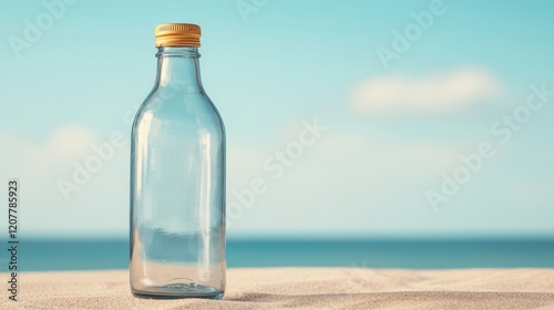 Empty glass bottle standing on sandy beach with ocean and blue sky in background