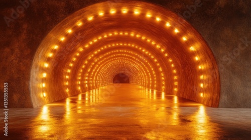 Empty, glowing tunnel with warm lights, modern interior. Possible use Architectural photography
