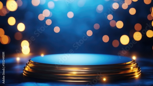 Empty golden podium on a vibrant blue background with glowing neon light effects and soft bokeh decorations. Luxurious, elegant scene design concept perfect for product display, branding, cosmetics