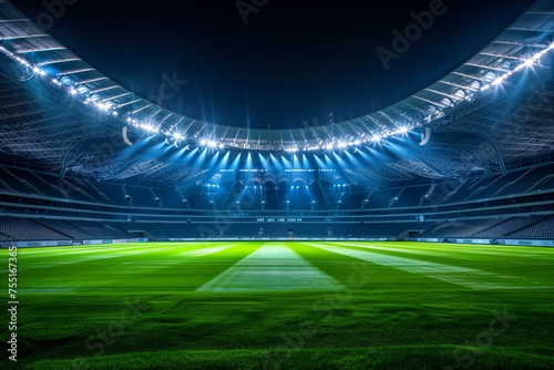 Empty grass field and illuminated outdoor soccer stadium - AI Generated