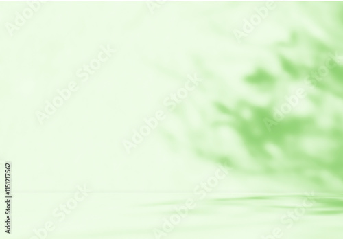 Empty green room studio with sunlight effect shadow of leaves. Minimal background for product presentation. Summer spring backdrop. Cosmetic and beauty products display room.