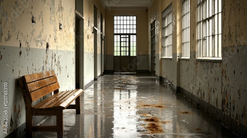 Empty hallway on death row. Abandoned corridor with a wooden bench and reflections on wet floor.