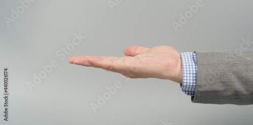 Empty Hand gesture in grey suit on grey background. Businessman topic. close up photo and studio shooting.