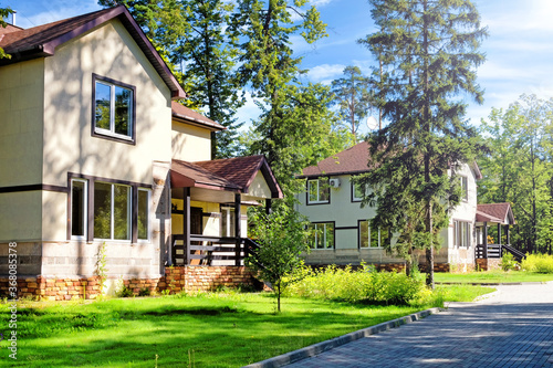 Empty house in cottage housing landscape with bricks road against trees and blue sky background. Empty street in city. Abandoned town. Unfinished construction building. Wide view