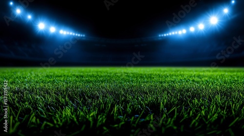 Empty illuminated stadium at night with green grass and rows of seats ready for sports event or concert. A tranquil nocturnal arena verdant turf awaiting a spectacle unoccupied rows