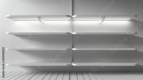 Empty illuminated white shelves on a white wall with a wood floor. Perfect for showcasing products or merchandise in a clean and modern setting.
