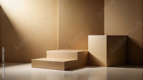 Empty interior with a box, golden box, and lamp illuminates the blank wall