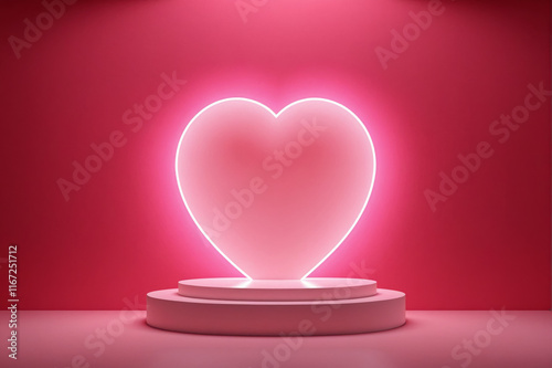 Empty light podium with glow neon on abstract background with heart shaped and copy space. Modern platform for product placement or montage, promotion, mock up. Wedding and Valentine's day concept.