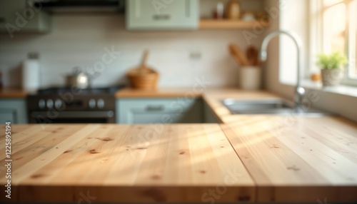 Empty light wooden kitchen tabletop. Sunbeams shine on light brown wood surface. Blurred background shows interior design of light-green kitchen. Modern home interior style. Home cafe interior