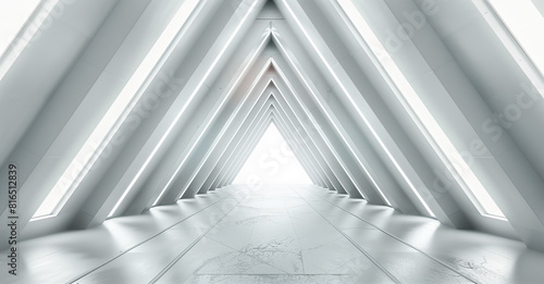 Empty Long Light Corridor. Modern white background. Futuristic Sci-Fi Triangle Tunnel. 3D Rendering.