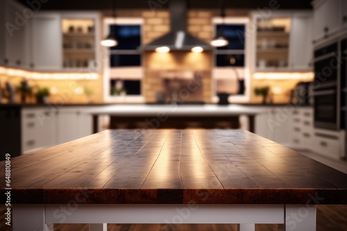 Empty luxury modern table with blurry background of kitchen, AI generated