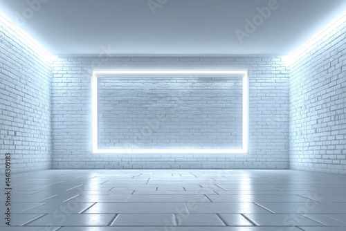 Empty, modern, white room with glowing neon frame. Brick walls, polished floor