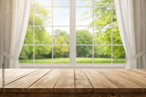 Empty of wood table top on blur of curtain with window view green from tree garden background. For montage product display or design key visual layout