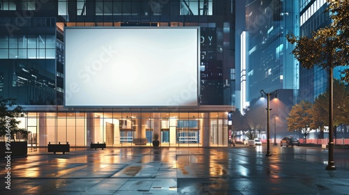 Empty office building billboard for advertising, with a white display on the wall at night.