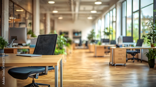 Empty office desk with chair and laptop.