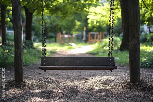 Empty park swing, sunny day, path, playground