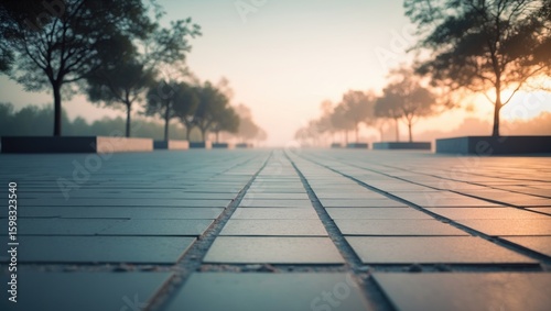 Empty paved walkway at sunrise or sunset with trees lining the path, creating a peaceful and serene atmosphere.