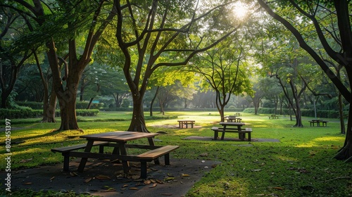 Empty picnic area in a park with tables and a green environment, perfect for social gathering themes