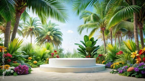 Empty podium on white sand surrounded by colorful palms and flowers with abstract rainforest background