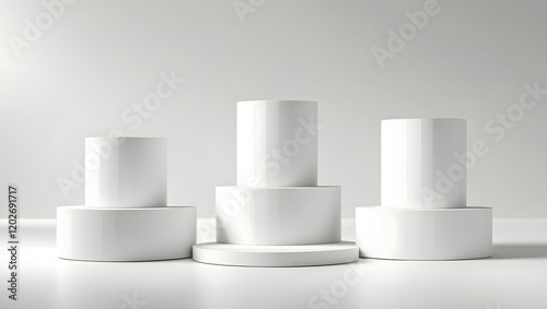 Empty podium or pedestal display on white background with cylinder stand concept. Blank product shelf standing backdrop. 3D rendering