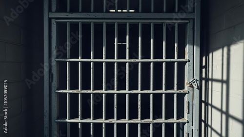 Empty prison cell with iron lattice door and bed, solitude, crime
