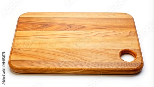 Empty rectangular wooden cutting board with rounded edges and hole lying on white background