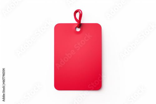 Empty red cloth tag isolated on white background. Shopping or sale, Black Friday, discount concept. Rectangle gift tag mockup, element for design. Cardboard tag with space for text, top view