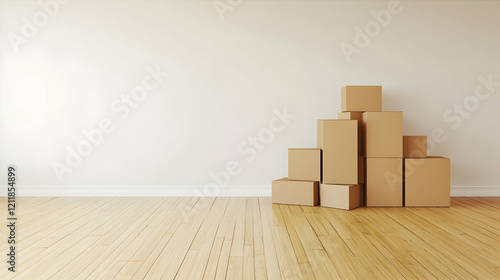 Empty room, cardboard boxes stacked, hardwood floor, relocation preparation, home moving