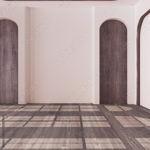 Empty room interior design, open space with dark parquet floor, classic arched windows, wooden ceiling and white walls, modern architecture concept idea