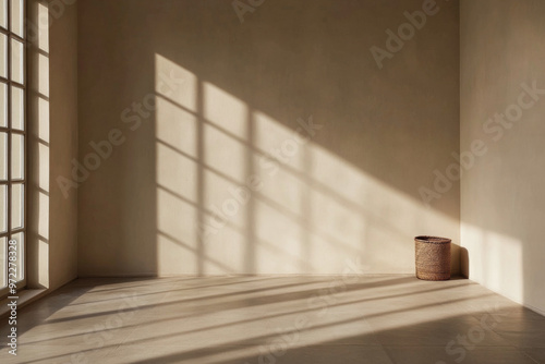 Empty room with a window providing natural lighting and casting shadows. Minimal residential interiors.