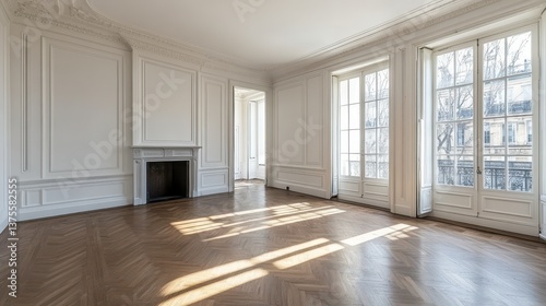 Empty room with fireplace, parquet floor, and large windows lets in sunlight. Good for interior design, real estate, or architectural visualization projects.