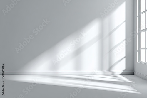 Empty room with sunlight streaming through a window, casting dramatic shadows on a white floor and walls