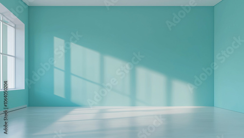 Empty room with teal walls and large window casting soft sunlight, creating a tranquil and minimalist atmosphere. Ideal for backgrounds or interior design concepts.