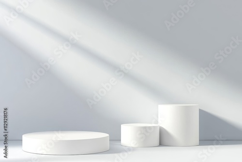 Empty round podiums illuminated by natural light on a minimalistic white wall for product display presentation