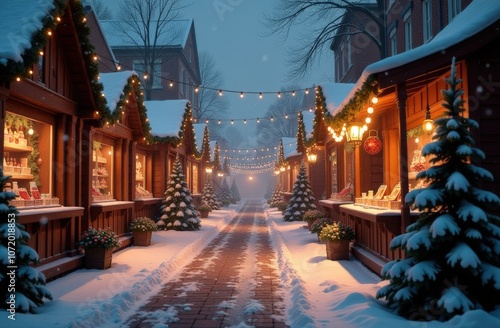 Empty rows of the Christmas market await shoppers. Evening, fog, fairytale atmosphere