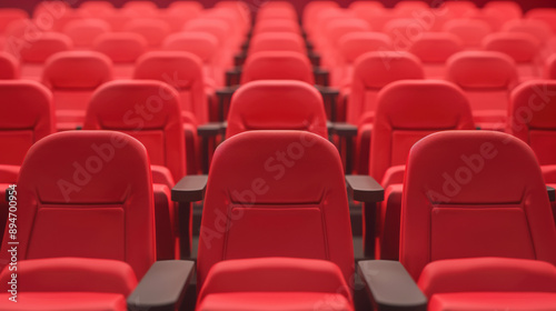 Empty rows of vibrant red theater seats ready for an audience. Perfect for cinema, entertainment, and performance-related themes.