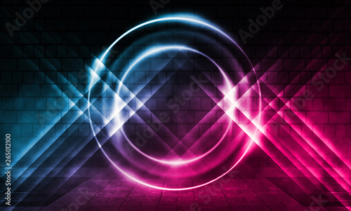 Empty scene background. Brick wall with multicolored neon lights and smoke. Neon shapes on a dark background. Dark abstract background