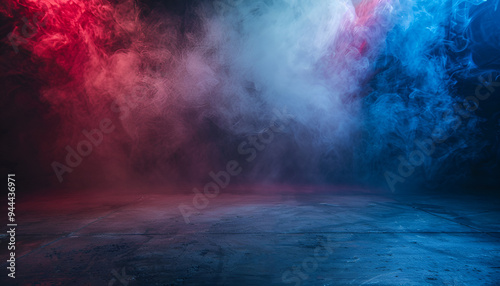 Empty space of Studio dark room with fog or mist and lighting effect red and blue on concrete floor grunge texture background