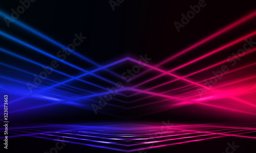 Empty stage, blue and pink, purple neon, abstract background. Rays of searchlights, light, abstract tunnel, corridor.