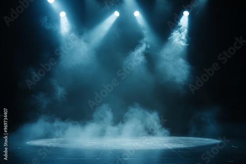 Empty stage illuminated by fog and spotlights for a product presentation in a theater